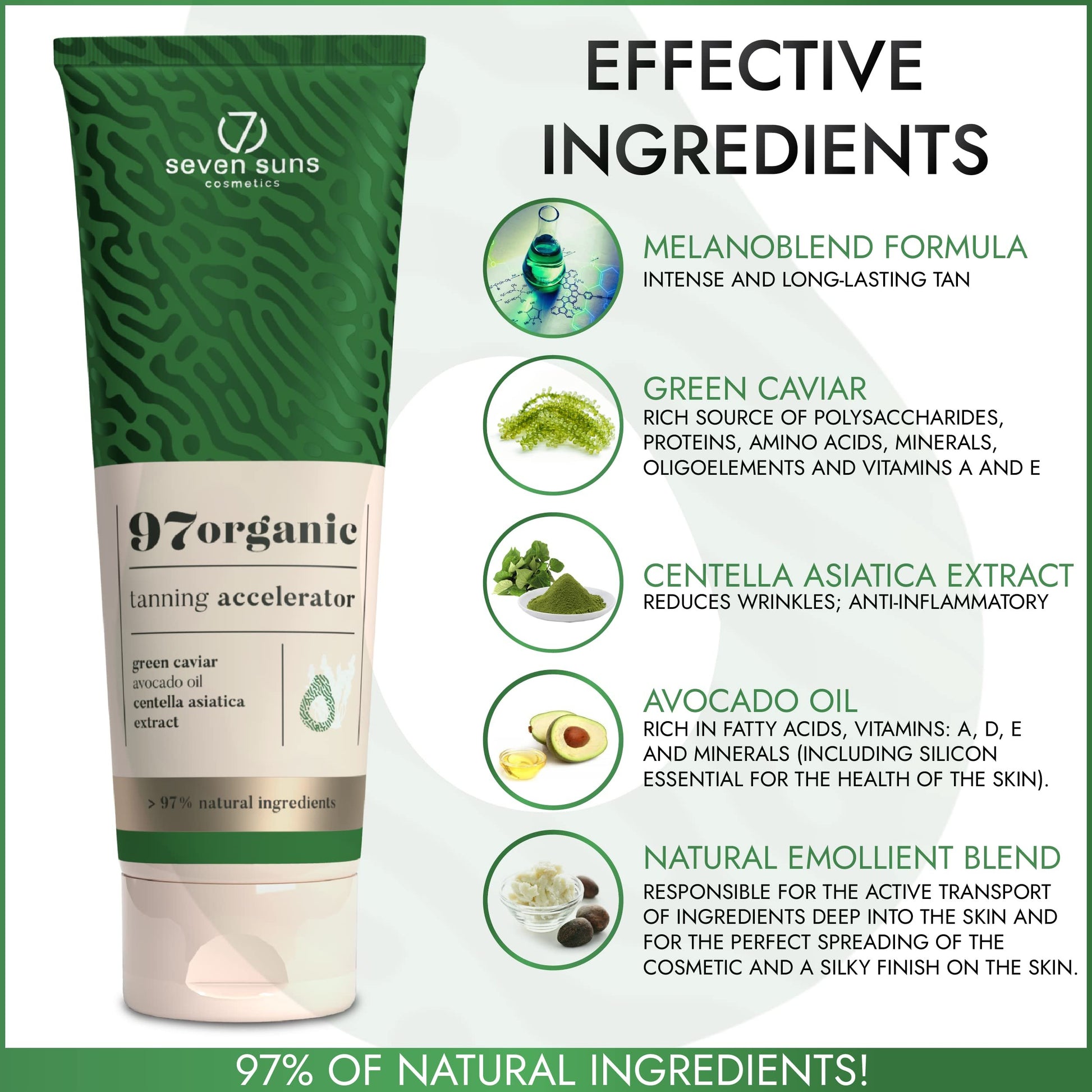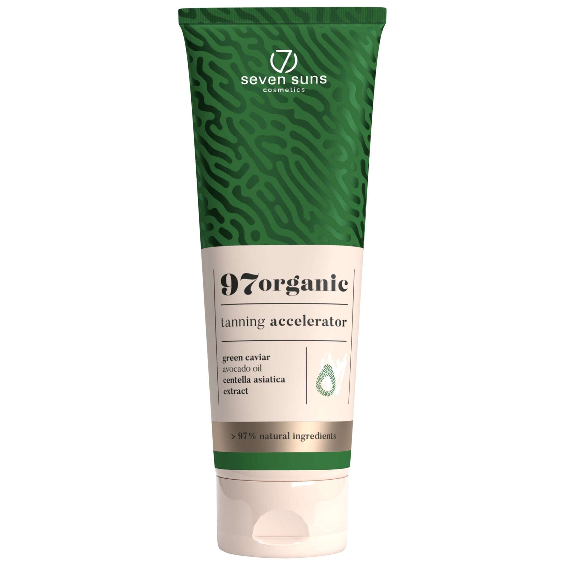 7 Suns 97organic's Dark natural bronze with every minute. The balm contains the proprietary MelanoBlend formula – which intensely stimulates the natural process of melanogenesis (skin pigmentation), which results in a beautiful, deep tan in a natural shade, just like after sunbathing. Caviar microcapsules attract and bind water – just like a sponge. It is thanks to them that the skin is beautiful and supple. Flexibility and smoothing are ensured by natural Asiatica extracts and avocado oil. Features: - Dark natural bronze accelerator - Strong moisturizing effect - More than 97% of natural ingredients - Zero Stickiness - Refresh Feeling - Fruity tropical fragrant finish - Minimize skin stains and streaksADVANCED TANNING ACCELERATOR: An advanced tanning accelerator with a strong moisturizing effect. 97organic is an uncompromising line of tanning accessories - with a guaranteed content of min. 97% of natural ingredients. The light consistency of the balm ensures instant absorption. The skin immediately becomes soft and smooth to the touch.RAPID TAN: 7 Suns is a tanning accelerator outdoor and indoor use for enhancing your tan in the blink of an eye. With this tan accelerator, you get proper hydration, wonderfully nourished skin, and a lack of signs of aging. Get tanned with this accelerator tanning lotion and enjoy your beautiful dark-tanned and glowing body!DEEPER & DARKER TAN: This advanced dark tanning accelerator intensifies your bronze glow & helps you achieve a darker tan. Blends effortlessly and absorbs quickly, allowing a smooth tan to develop in the sun or on a sun bed. The first tanning effects are visible right after the end of the session.KEY INGREDIENTS: Melanoblend formula - a unique complex of ingredients of natural origin, strongly influencing the acceleration of the appearance of an intense and long-lasting tan. Green caviar- It attracts and binds water like a sponge. Rich source of polysaccharides, proteins, amino acids, minerals, oligo-elements and vitamins A and E, Centella Asiatica extract, Avocado oil, and a mix of natural emollients.SAFE TO USE: This tanning intensifier uses high-quality ingredients that are safe for men and women and all skin types, even for the most sensitive skin. Gluten-free, paraben-free, never tested on animals. Apply and massage evenly throughout the body for the best result.