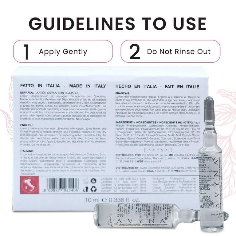 No-rinse restructuring ampoules, enriched with Keratin, Shea Butter and Wheat Protein. It reinforces the roots of damaged hair providing shine and softness thanks to the silicon micro emulsions action. Does not leave any residuesLeave -In Reconstruction Lotion12 Individual Treatment VialsRestores strength and brilliance to dry and damaged hair.Softens hair for a smooth and silky finish.