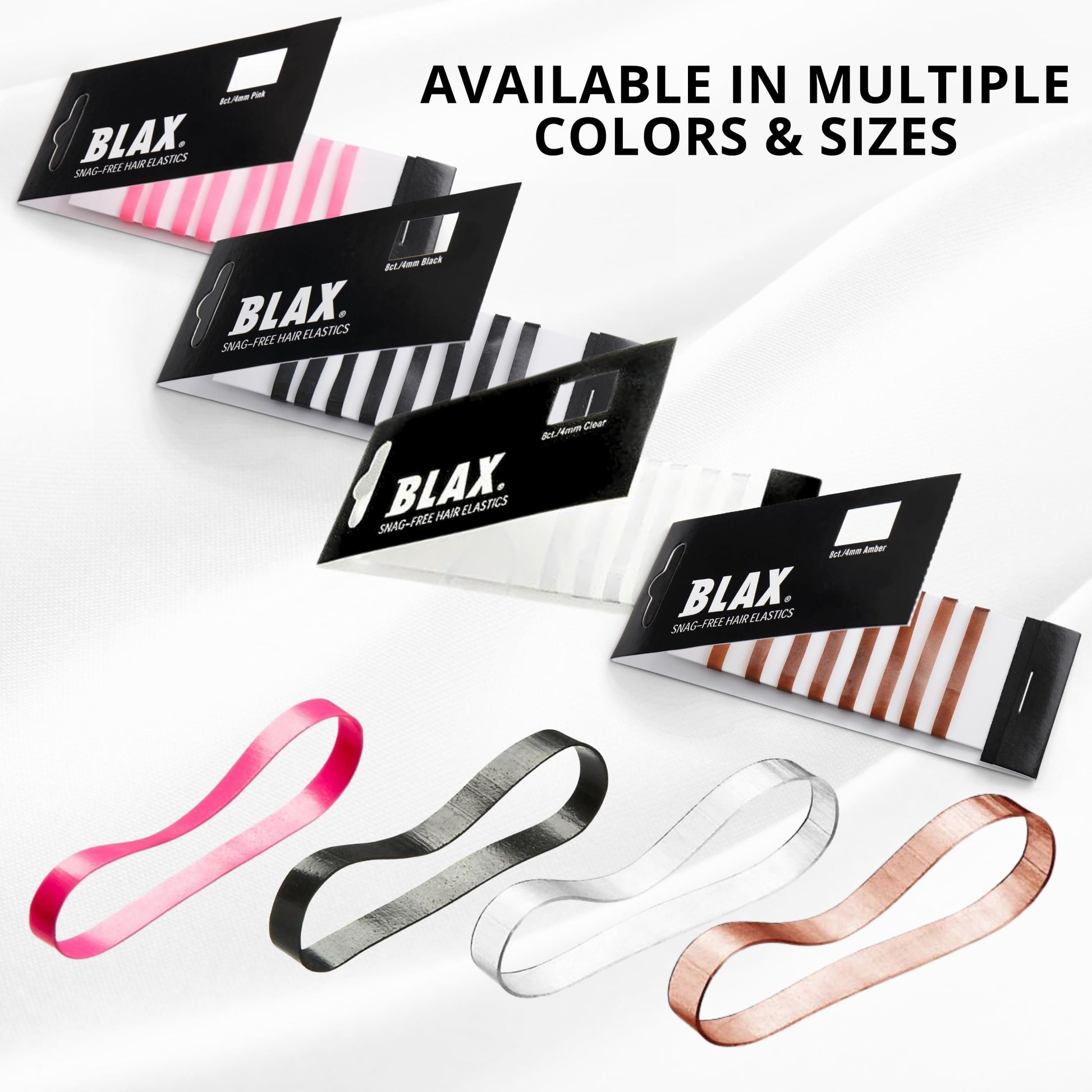 BLAX are great for all types of hairstyles (ponytails, braids, etc.). Ideal for men, women, or children, Blax is made from 100% polyurethane and will not snag, tangle, or damage hair when removedFeatured in Allure and In Style Magazines (multi-year winner of “Best Beauty Buys”)Used by many of the world’s most renowned hair stylistsGlides off hair when removed4mm width 8 elastics per pack