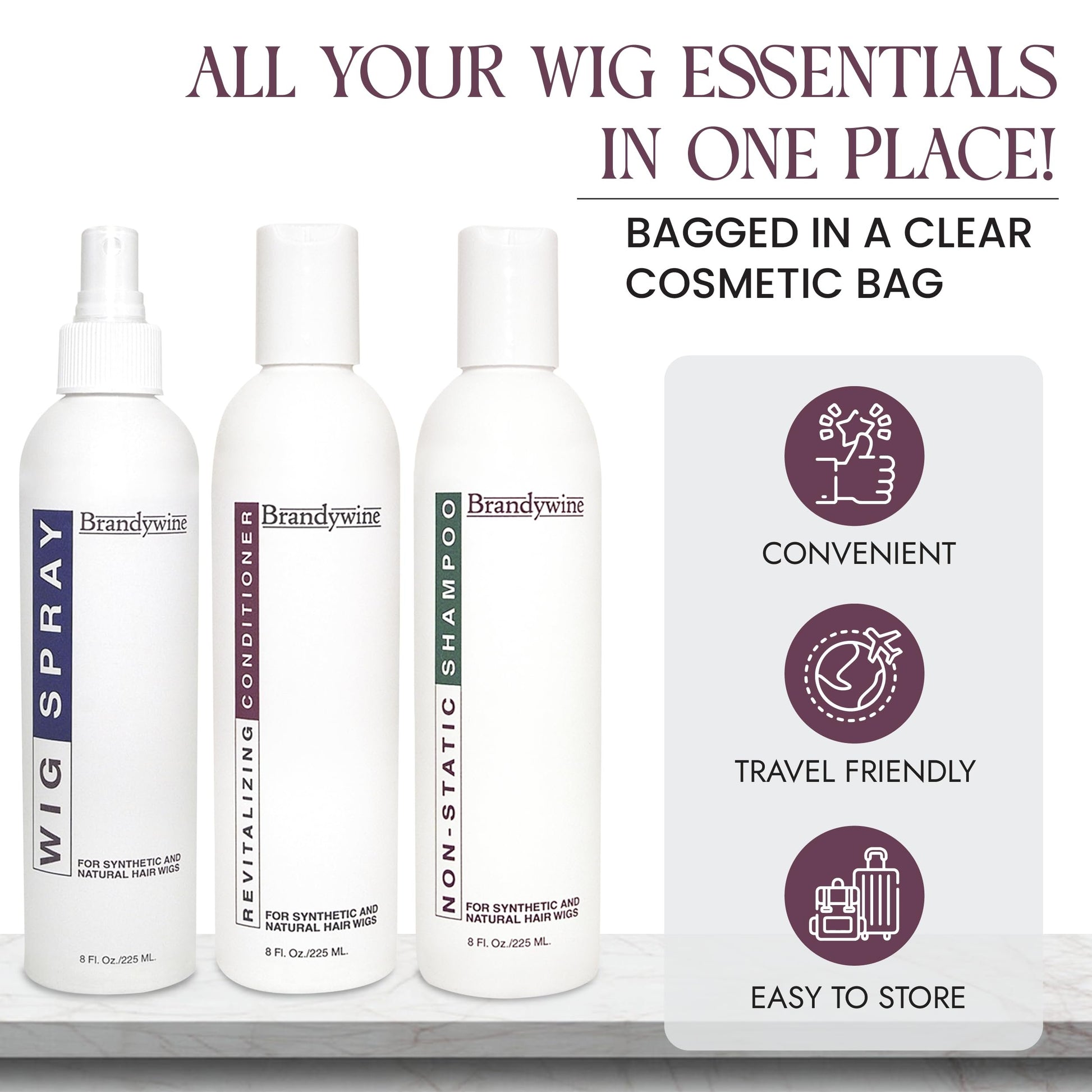 Brandywine Synthetic Wig Maintenance Kit (Kit)Brandywine Non-Static Wig Shampoo, 8 fl oz / 236 mLBrandywine Revitalizing Wig Conditioner, 8 fl oz / 236 mLBrandywine Non-aerosol Wig Spray, 8 fl oz / 236 mLMaintain the beauty of your synthetic and human hair wigs and hairpiecesPacked in clear cosmetic bag with outside zippers making it convenient for travel and storage