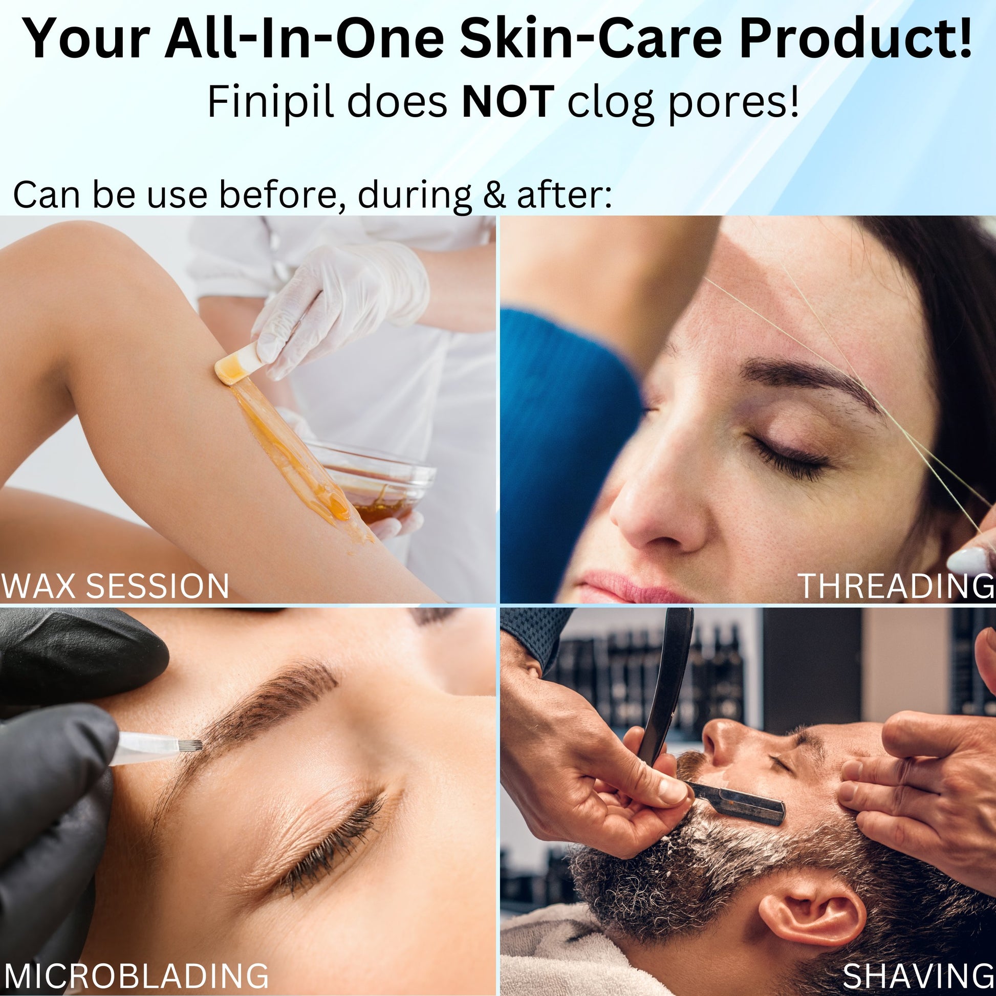 finipil is a sanitizer and moisturizer with endless uses! finipil does NOT clog pores like so many other greasy antiseptics, it actually cleans while moisturizing them. Originally created for comfort and safety after and between Nufree hair-removal treatments (your non-wax hair-removal alternative), it is also perfect for use after other old fashioned wax-care services. finipil is a patented, FDA-registered antiseptic cream that destroys and kills 99.999% of bacteria (germs, staff, etc.). It cools and soothes the skin all while helping to protect hair follicles from infection.This patented formula is 100% effective as an antibacterial and antimicrobial treatment.Cools, shrinks and reduces swelling. Breaks fats and oils to prevent clogging.Protects the hair follicle, gets rid of in-grown hairs and prevents new ones.