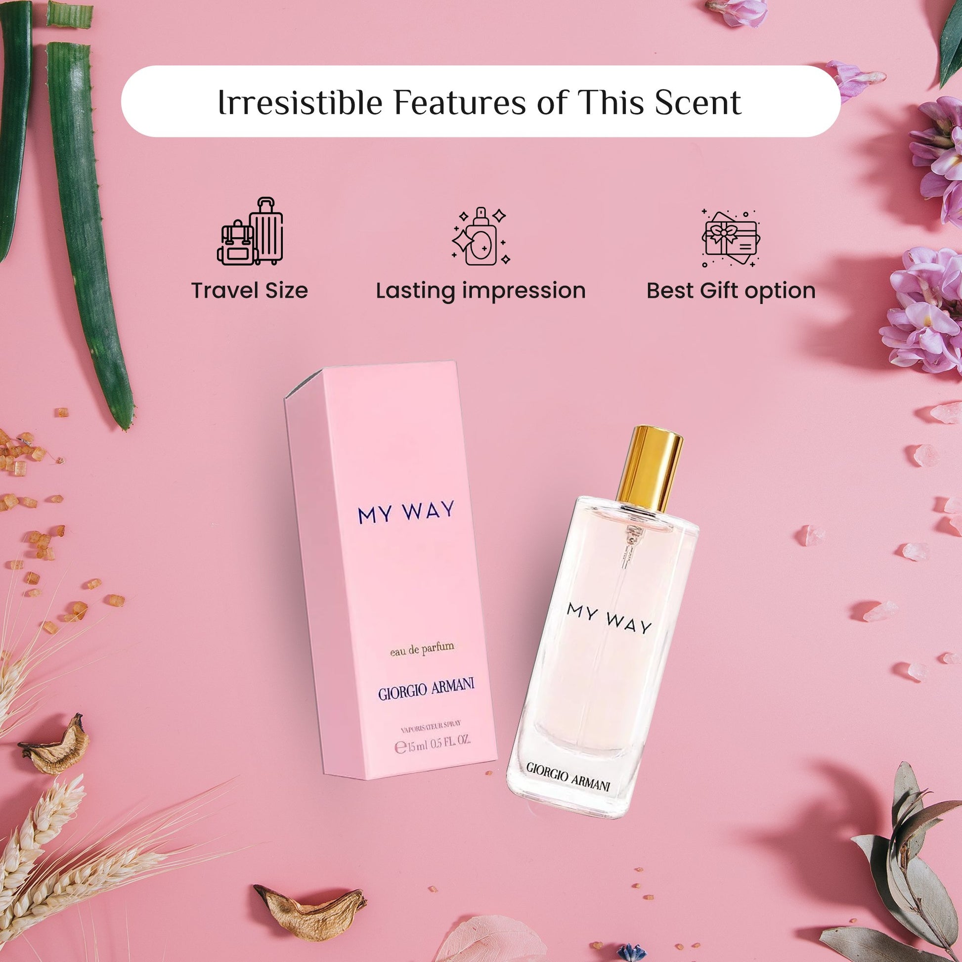 GIORGIO ARMANI My Way Eau de Parfum Spray for Women, 0.5 OunceDiscover My Way, the new feminine fragrance by Giorgio ArmaniThe elegant eau de parfum is an invitation to broaden your horizons and live meaningful encounters around the worldMy Way Eau de Parfum Travel Spray is the scent of discoveries and connections for an openminded, curious and authentic woman who is ready to broaden her horizonsA bright white floral bouquet is encapsulated in a talisman bottle, a metaphor for the world.Great for Travel. TSA approved