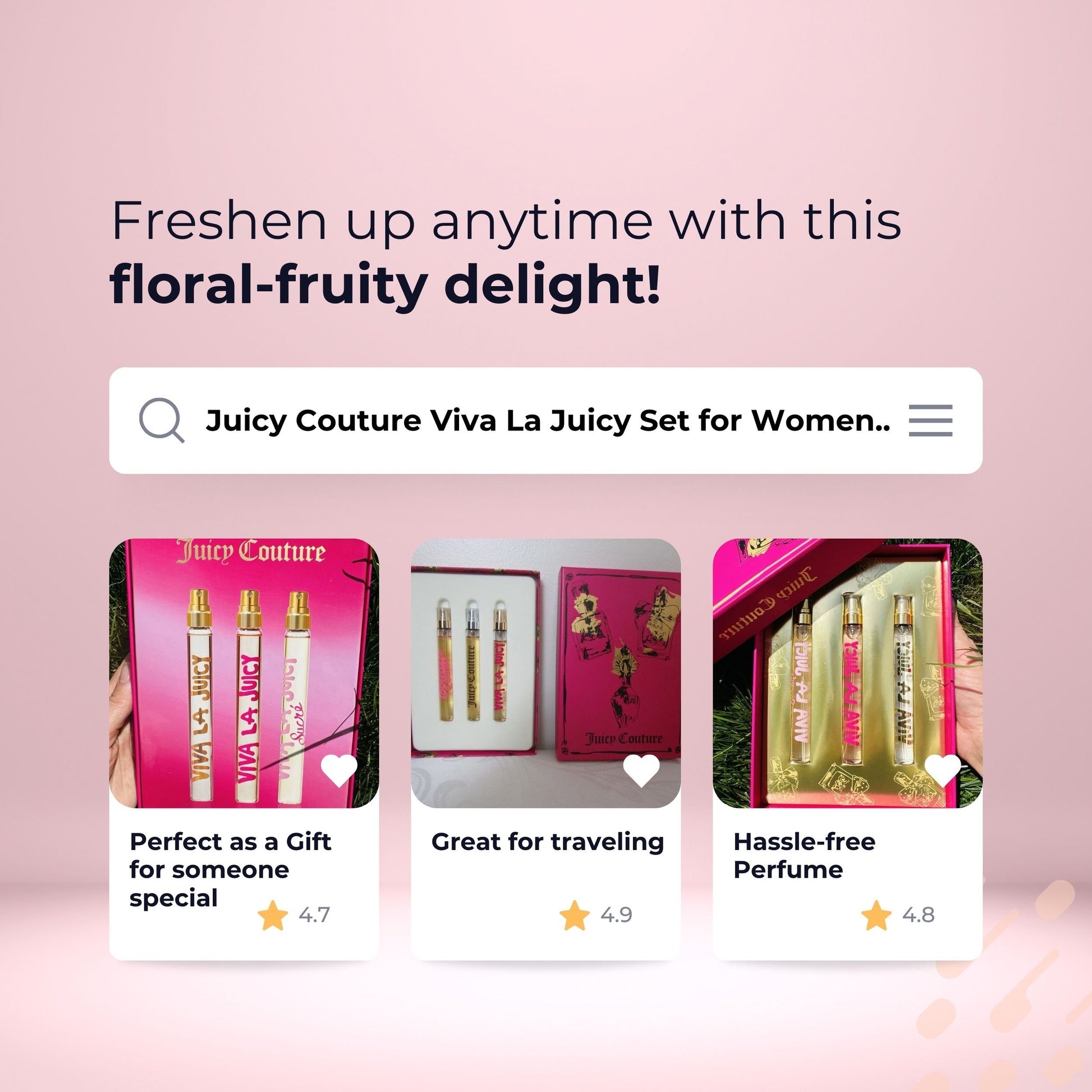 Indulge in the iconic scent of Viva La Juicy with this Juicy Couture 3-Piece Fragrance Travel Spray Gift Set. This stylish and feminine perfume set includes three portable Eau de Parfum sprays, designed for the modern woman on the move.