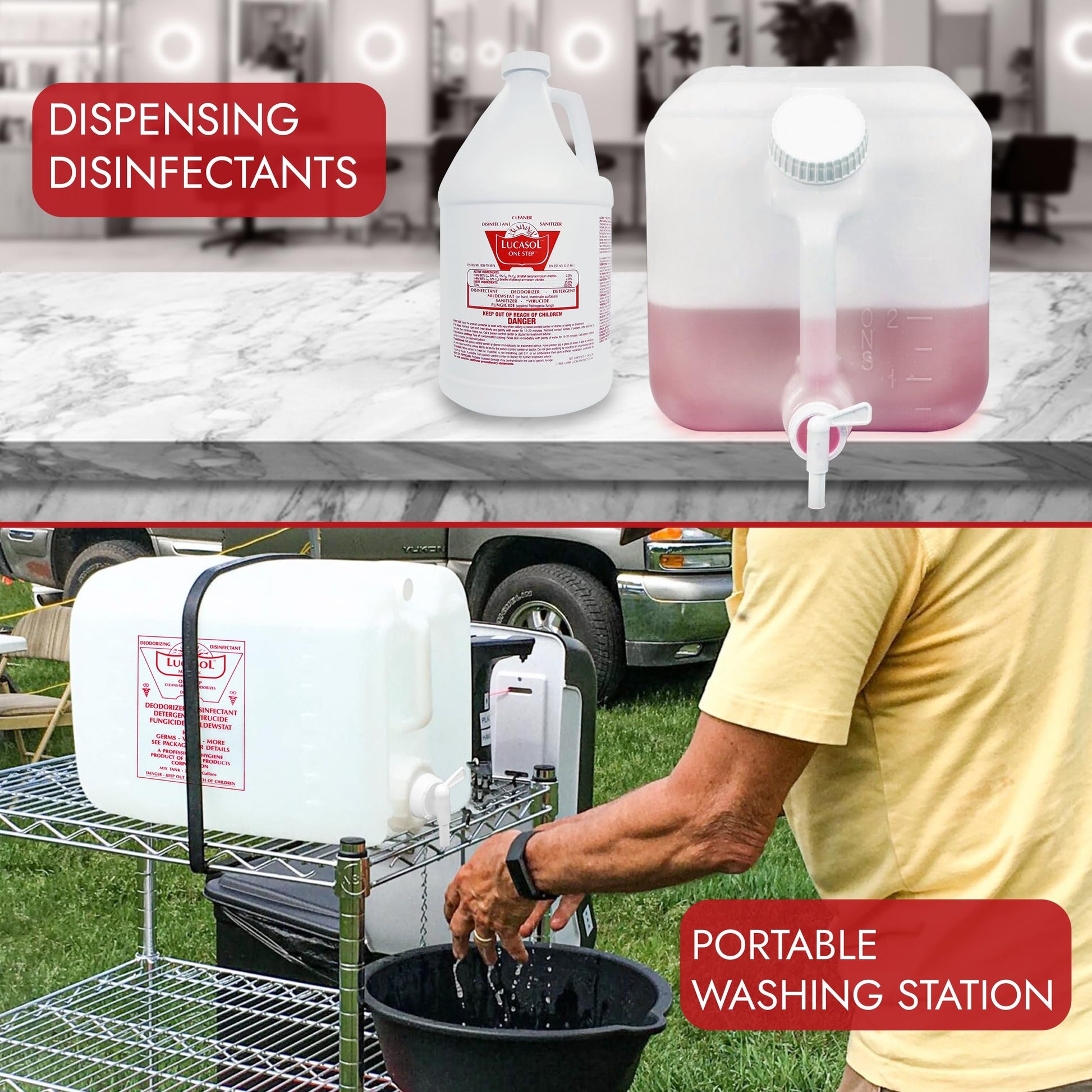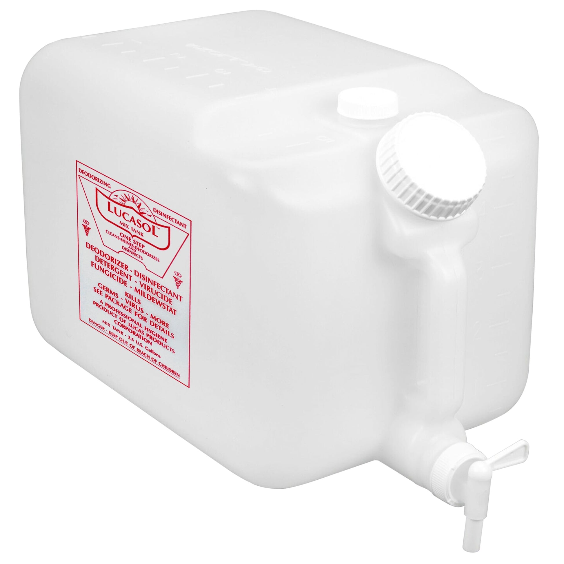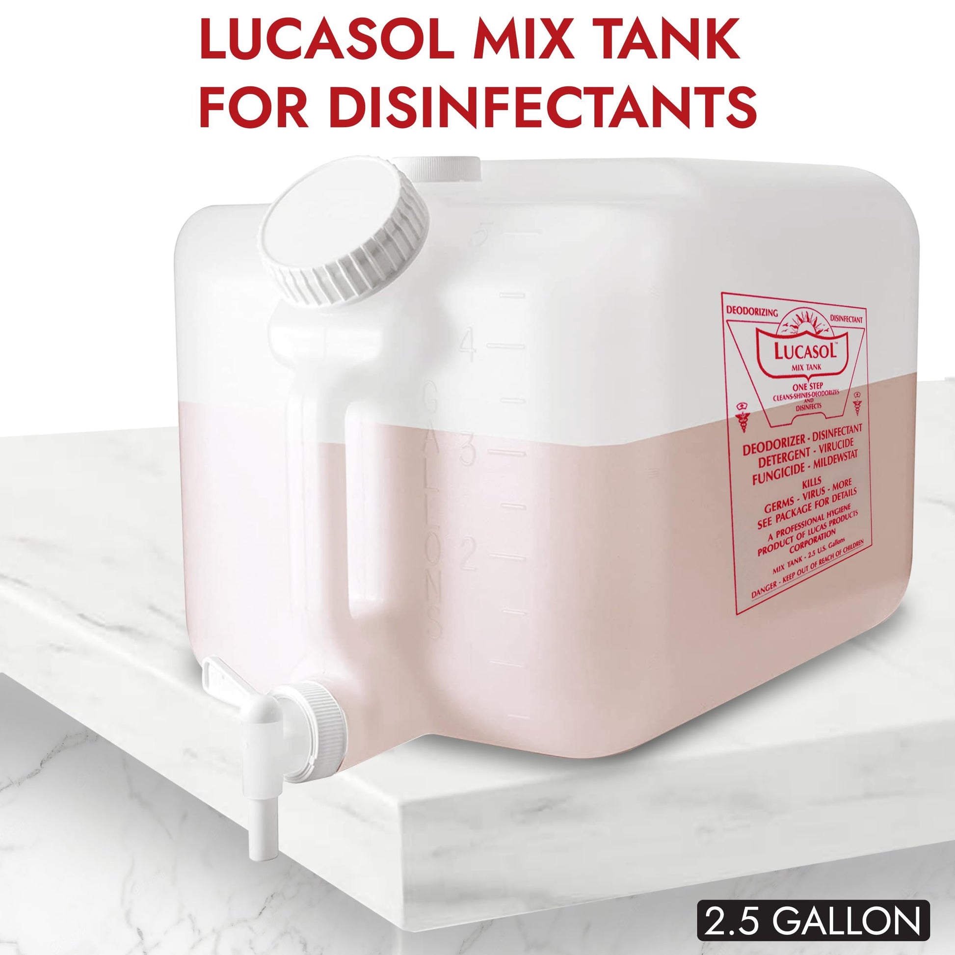 Lucasol 2.5 Gallon Chemical Dispenser - Disinfectant Mix TankA portable water tank with an inbuilt spigot that can be used as a chemical mixing dispenser.Durable plastic 2.5 gallon water dispenser that sustain harsh chemical and disinfectant.With Lucasol mix tanks, you can easily refill the liquid by twisting the spigot.This gallon mix tank can be used with any disinfectant and all you need to know the proper concentration.Use for liquid dispensers, camping washing stations, water dispensers, storage tank and more.