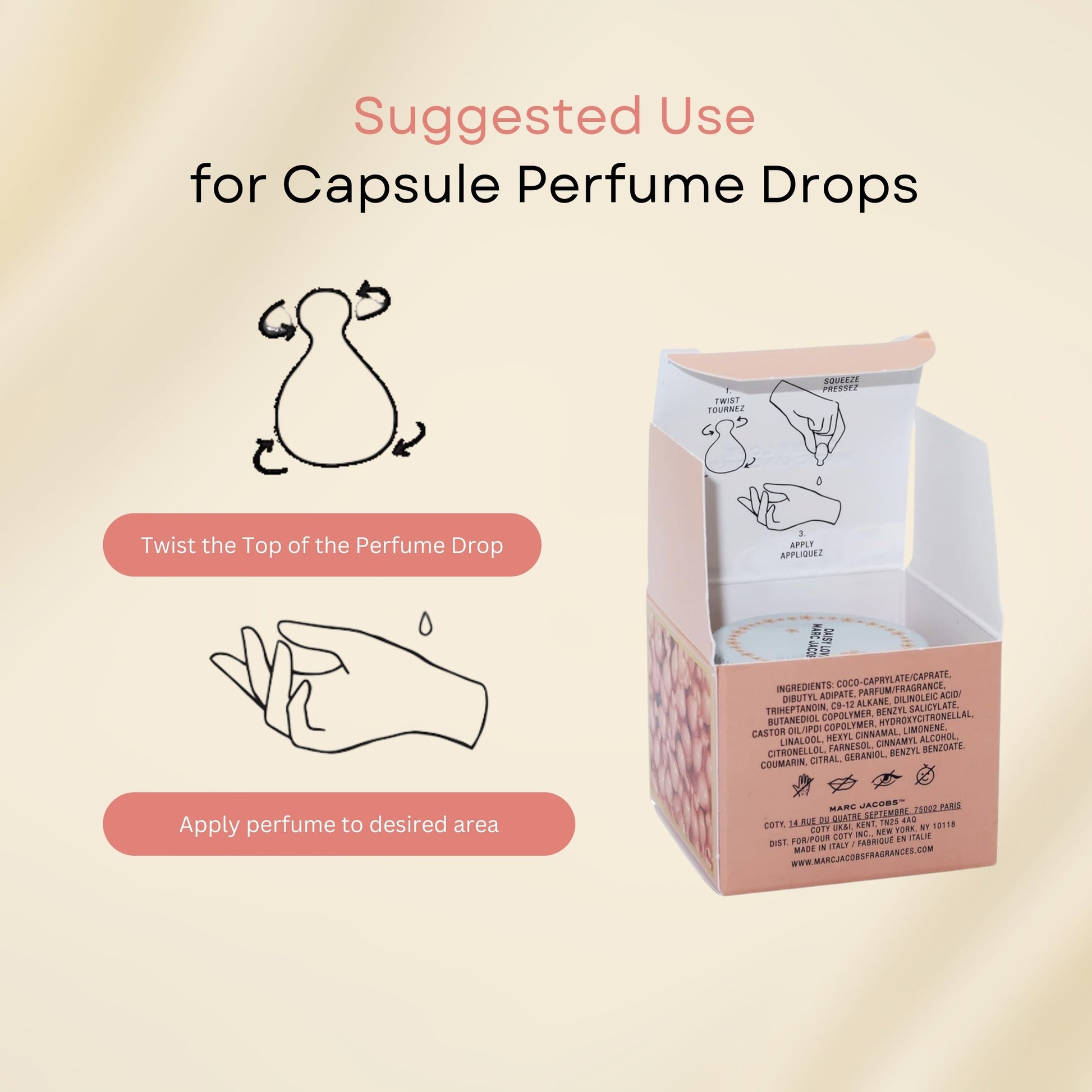 Experience the cuteness and fun of the Marc Jacobs Daisy Drops Signature Capsules. These tiny capsules are perfectly dosed with a gel-like fragrance composition that is alcohol-free, making them gentle on the skin. As part of the enchanting Daisy Drops collection, this fragrance has been specially formulated to provide a long-lasting scent that will keep you smelling fresh all day long. Get ready to be enchanted by the adorable and fun fragrance experience that these capsules offer. Each pack contains 30 purse drops, perfect for on-the-go freshness.MARC JACOBS SIGNATURE SCENT – Enjoy the iconic Daisy Eau So Fresh fragrance, crafted with delicate floral and fruity notes that exude elegance and charm.DAISY EAU SO FRESH FRAGRANCE DROPS - A delightful and fun way to wear the signature Marc Jacobs Daisy Eau So Fresh scent in a convenient, single-use format.WOMEN’S FRAGRANCES FOR EVERY OCCASION - A perfect floral fragrance for work, travel, or evening wear.TRAVEL PERFUME PERFECT FOR ON-THE-GO – These individually portioned fragrance pearls are ideal for travel, purses, or quick touch-ups throughout the day.30 SINGLE-USE PEARLS – This pack includes 30 easy-to-use fragrance pearls, ensuring effortless application wherever you go.