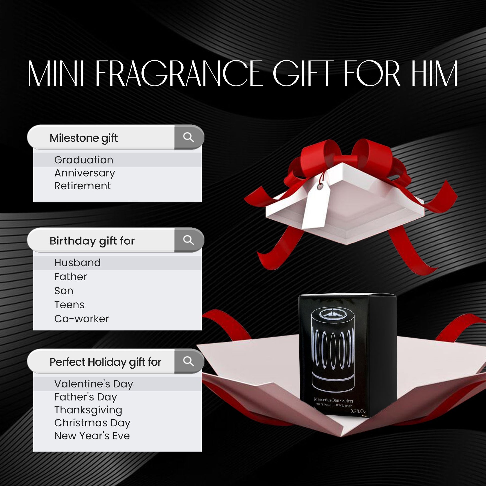 Mercedes-Benz Select Travel Collection, Classic and Legendary with Long-Lasting Notes, Choose The Freshness Of a Fruity Bergamot & Blackcurrant Accord, Eau De Toilette, Original, 0.68 OzA SIGNATURE MASCULINE ELEGANCE. The emerging scents of blackcurrant and fruity bergamot transition into an intense aroma of peppermint and apples, and ultimately transform to engaging amber and patchouli fragrances.AN INTENSE SENSUAL MAGNETISM. The power of irresistible seduction contained within this bottle of Select is both lively and intense. This quintessential essence, created by masters of the aromatic craft, is exceptional in every way.LONG LASTING. Our fragrance’s one and only scent remains throughout the day, providing a signature aroma for as long as possible. The irresistible notes will undoubtedly draw others toward you.A CHARISMATIC DESIGN. Select's widely popular bottles possess almost human-like curves. Smooth and sensual, but with an undeniably masculine design. With heavy and glass a slanted cap featuring the encircled star, this container is a sight to behold.THE BEST OR NOTHING. Innovative and demanding, Mercedes-Benz is much more than just an automobile manufacturer. Now the brand creates exceptional bouquets full of heady charm, an innate sense of detail and a passion for the rare and unexpected.