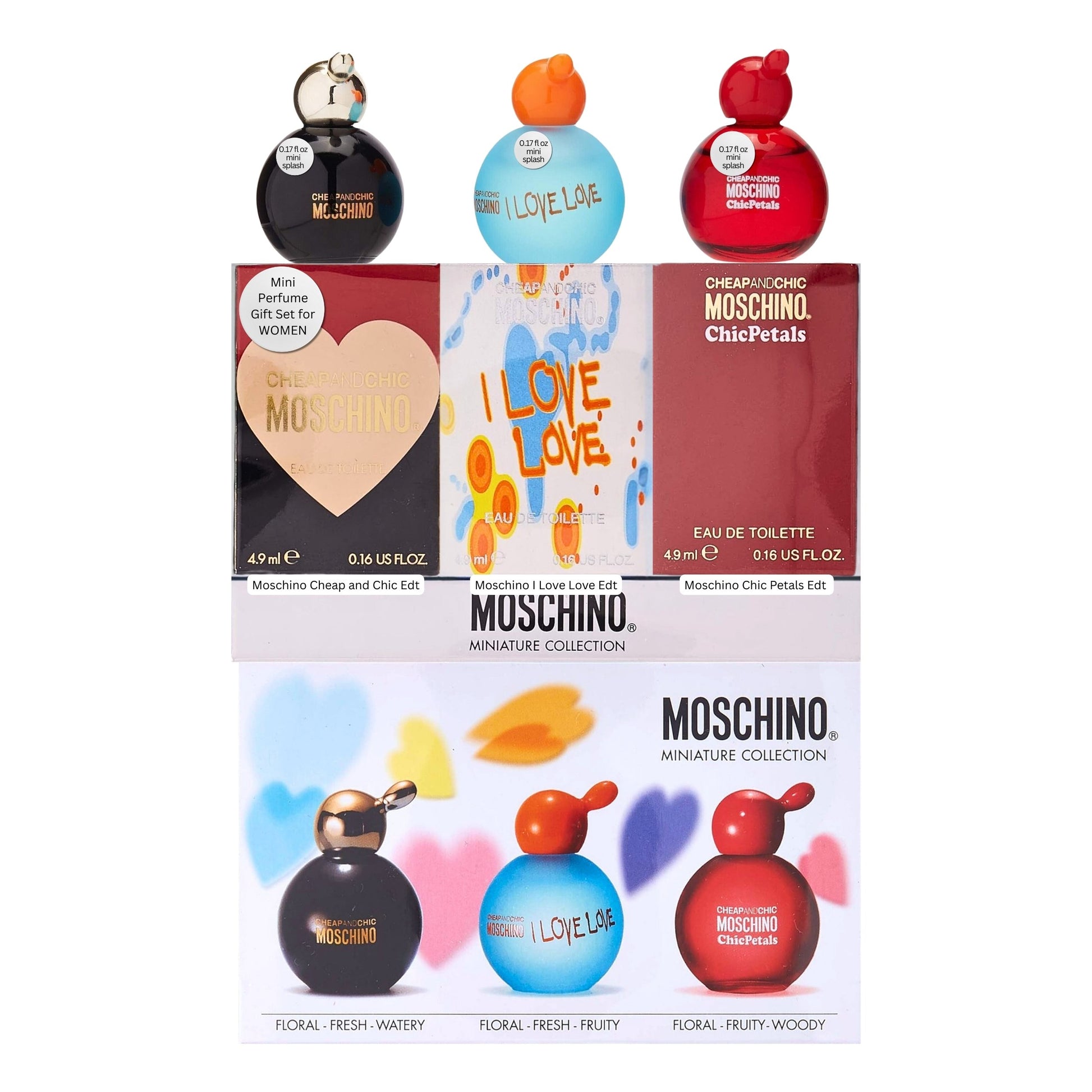 MOSCHINO Perfume for Women Variety Gift SetMoschino Cheap and Chic Edt 0.16 oz SplashMoschino Chic Petals Edt 0.16 oz SplashMoschino I Love Love Edt 0.16 oz Splash3 mini Travel Size perfume SplashesMoschino Perfume Sampler Set