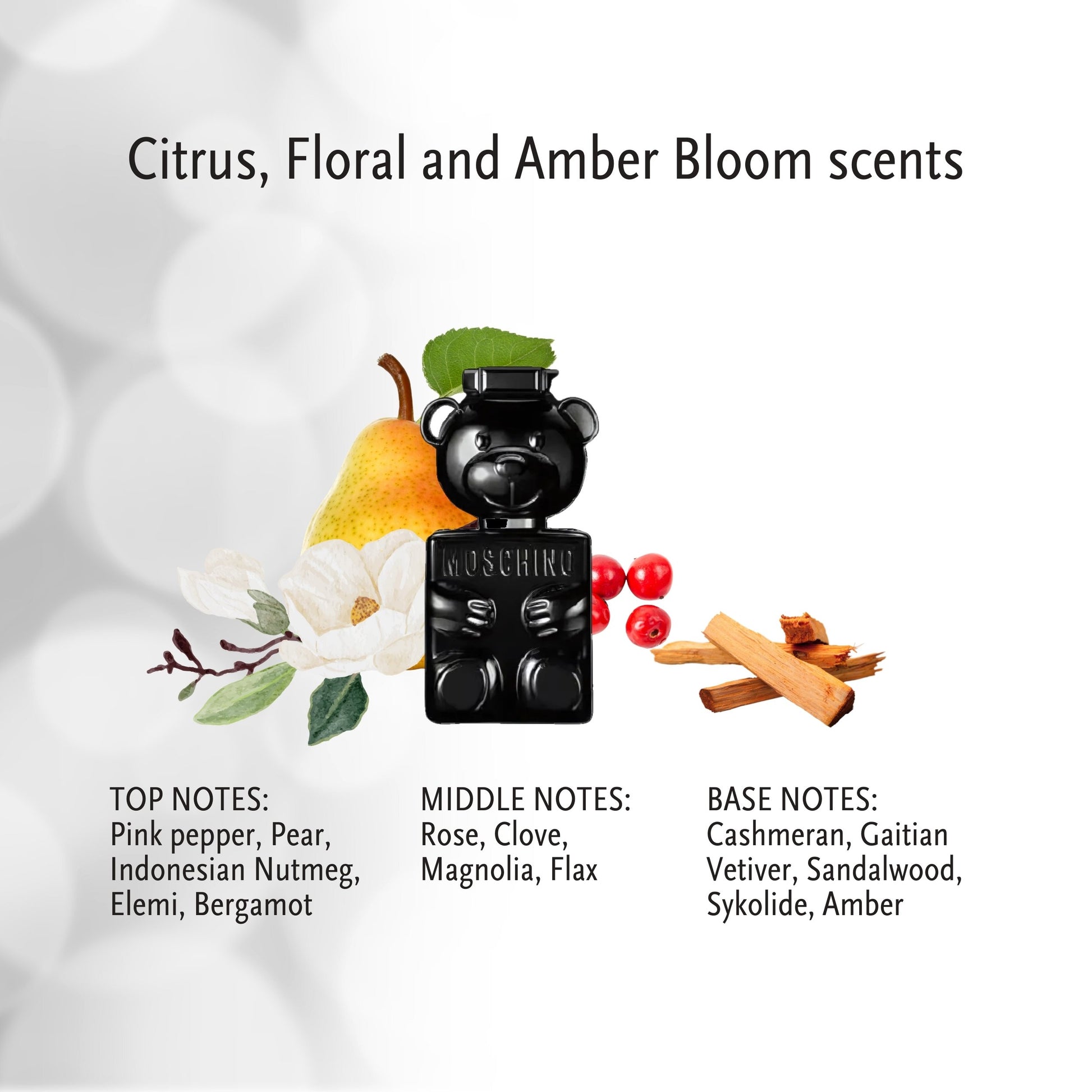 Moschino Toy Boy by Moschino is a lively fragrance released in 2019. The top notes include tart, bitter, citrusy bergamot; rosy, spicy pink pepper; aquatic, fresh pear; balsamic, piney elemi; and pungent, earthy Indonesian nutmeg. The middle notes are nutty, mild flax; lush, waxy magnolia; lemony, powdery rose; and spicy, warm clove.