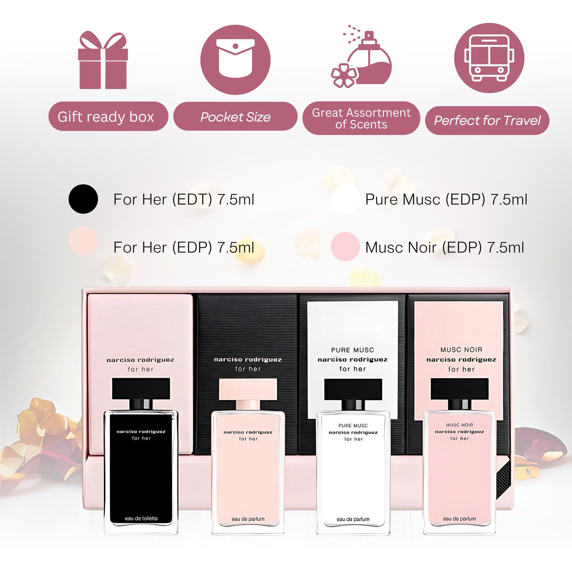 Discover the elegance of Narciso Rodriguez with this For Her Mini Splash Variety Perfume Set. This set includes four luxurious scents: For Her Eau De Parfum, For Her Eau de Toilette, Pure Musc Eau De Parfum, and Musc Noir Eau De Parfum, each in a 0.25 oz size. Perfect for travel or as a thoughtful gift, this set offers a versatile selection of sophisticated fragrances for the modern woman.For Her Eau De Parfum for Women Mini Splash 0.25 OzFor Her Eau de Toilette Mini Perfume Splash 0.25 OzPure Musc Eau De Parfum 0.25 OzMusc Noir Eau De Parfum 0.25 OzWomen Perfume Travel Size Mini Gift Sets