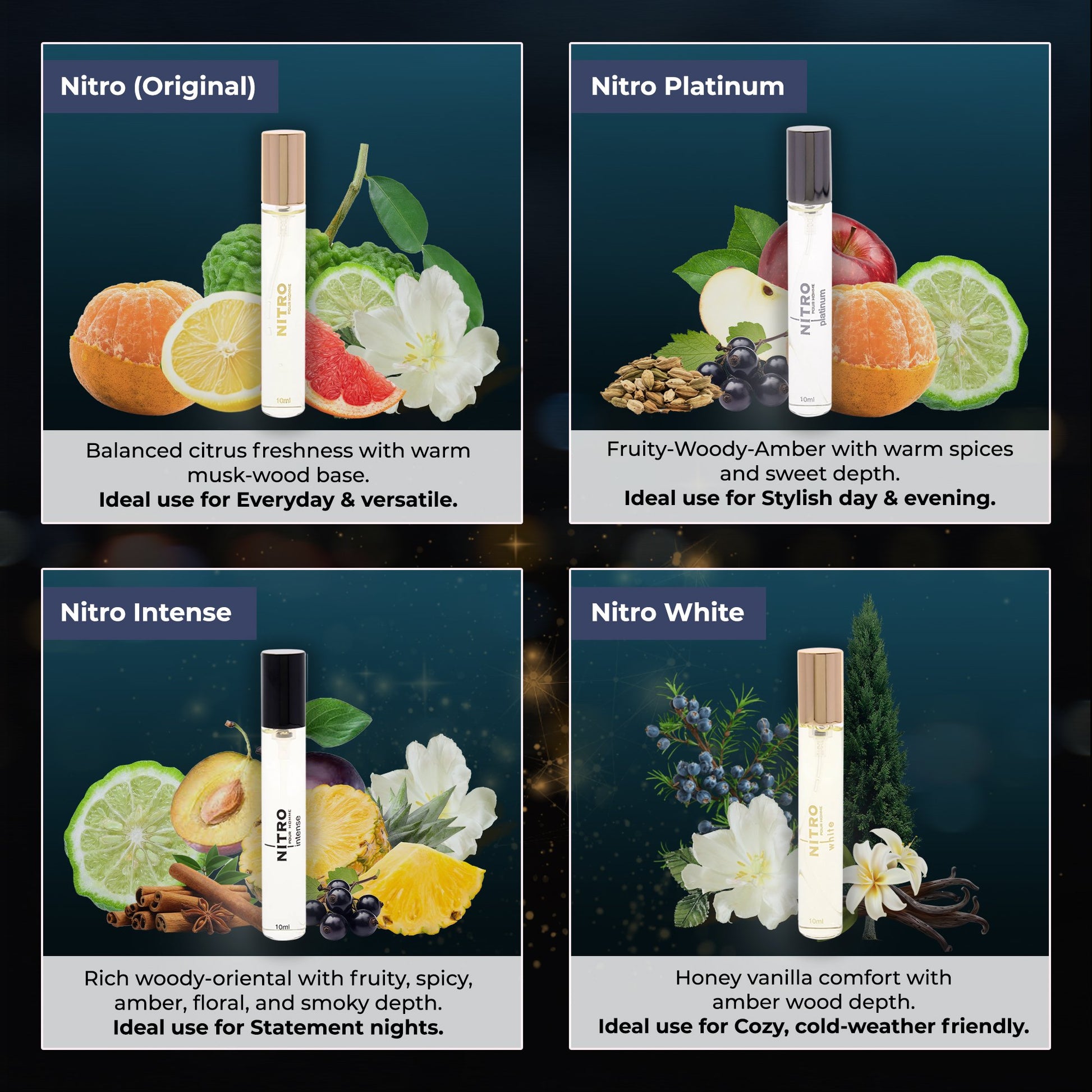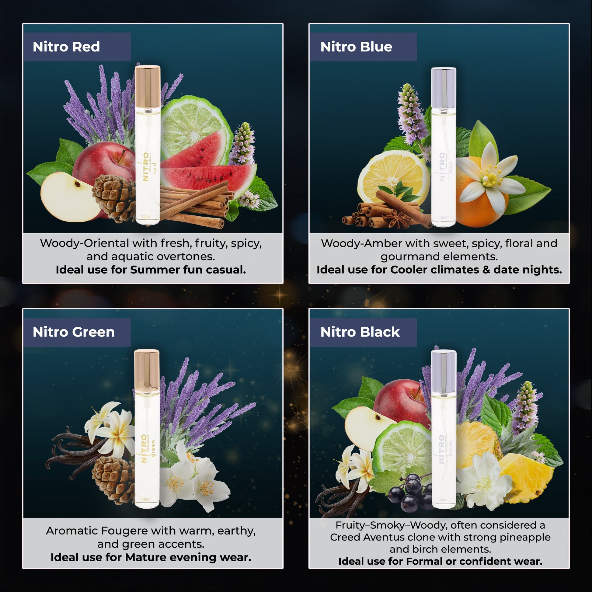 NITRO Black + Pour Homme + Green + Intense + Red + Platinum + White + Blue 10ml eachNitro 8 Piece Coffret Set contains 10ml each: Nitro Red Nitro White Nitro Platinum Nitro Intense Nitro Pour Homme Nitro Black Nitro Green