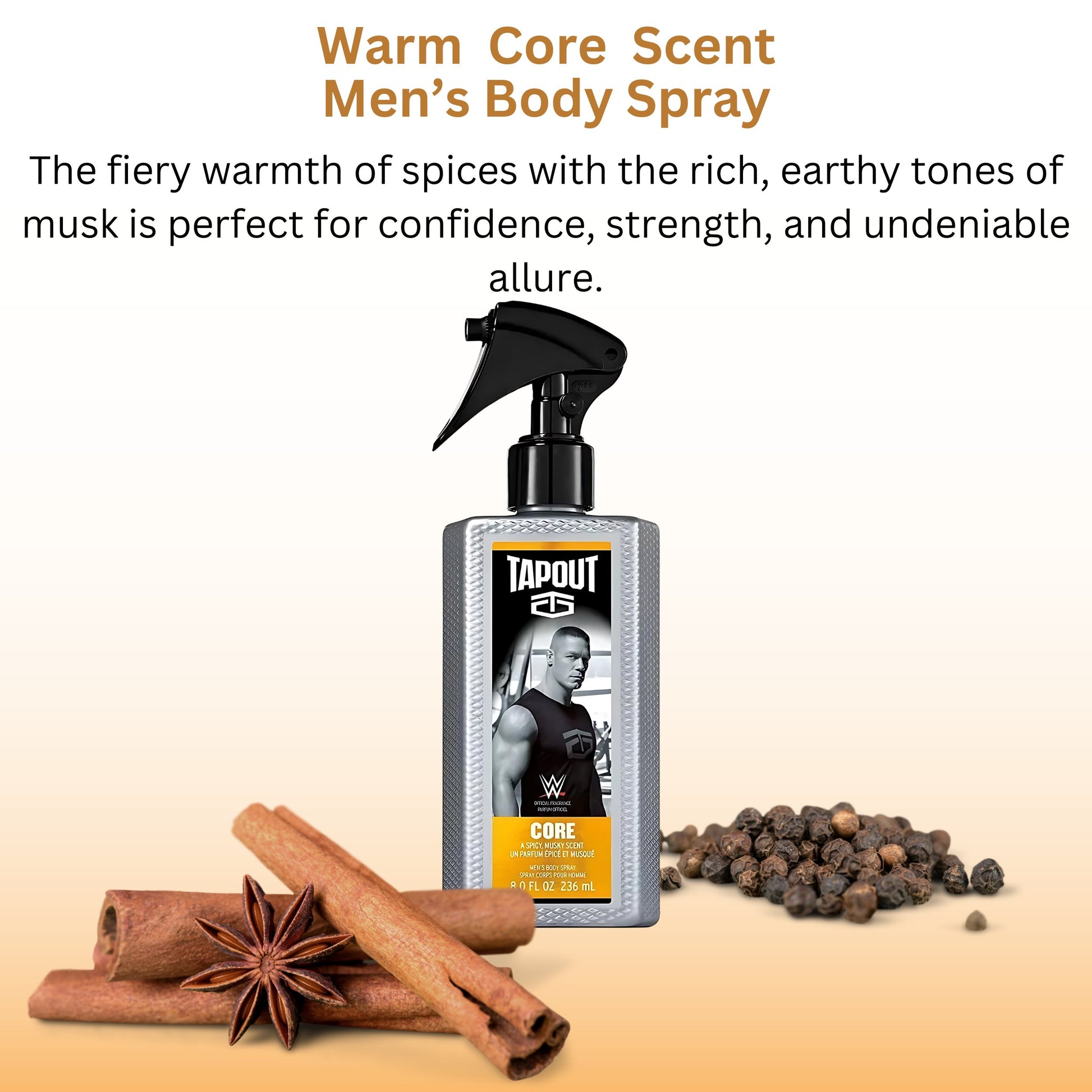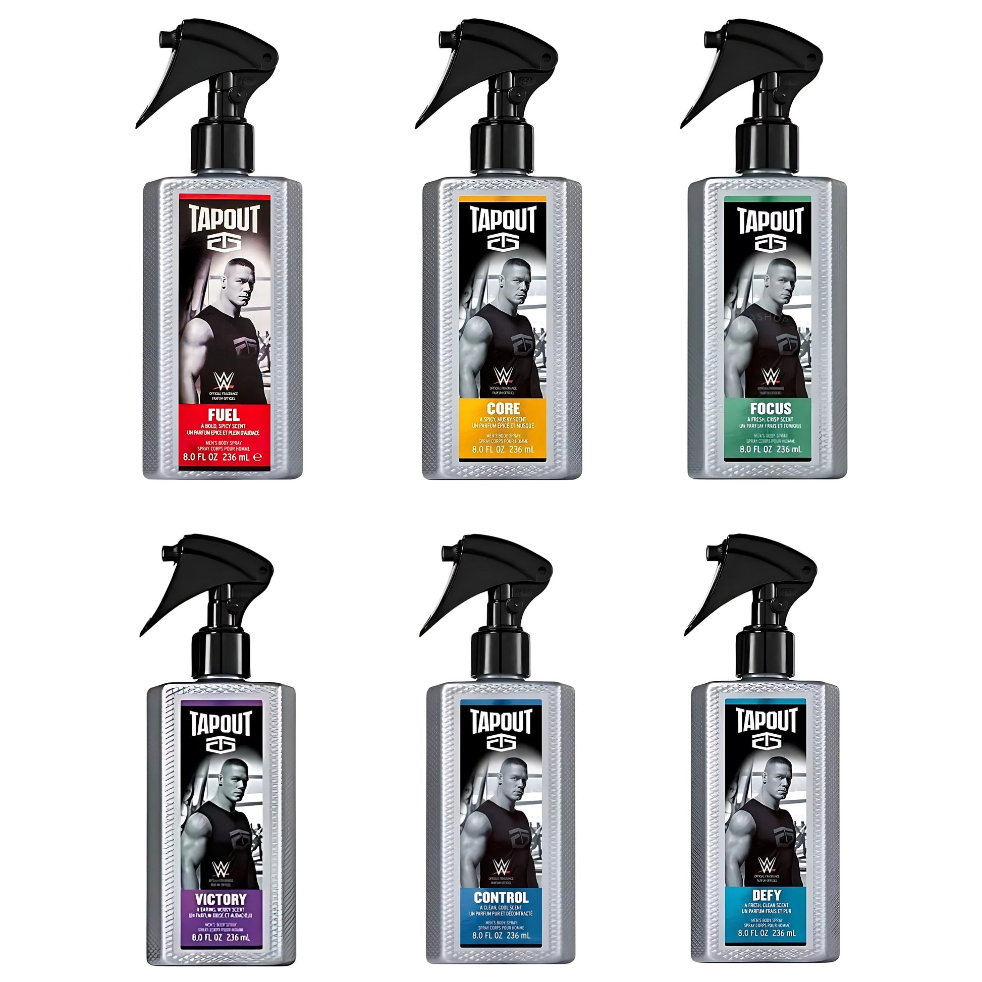 PACK OF 6 Bottles Tapout Collection for Men. Each bottle is 8 oz (236 ml) Body Spray including CORE + CONTROL + VICTORY + FOCUS + FUEL + DEFYMens Body Spray Gift SetCORE - A Spicy Musky Scent 8 oz (236 ml) Body SprayCONTROL - A Clean Cool Scent 8 oz (236 ml) Body SprayVICTORY - A Daring Woody Scent 8 oz (236 ml) Body Spray - Be Victorious with this daring, woody scentFOCUS - A Fresh Crisp Scent 8 oz (236 ml) Body Spray - Get Focused with this fresh, crisp scentFUEL - A Bold Spicy Scent 8 oz (236 ml) Body SprayDEFY - A Fresh Clean Scent 8 oz (236 ml) - Defy the odds with this fresh, clean scent