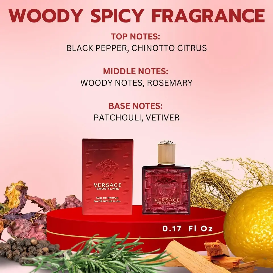 Experience the bold intensity of Versace Eros Flame Eau de Parfum for Men in a convenient mini splash bottle. This passionate and powerful fragrance blends fresh citrus, warm spices, and rich woody notes to create a captivating scent designed for confident, modern men.