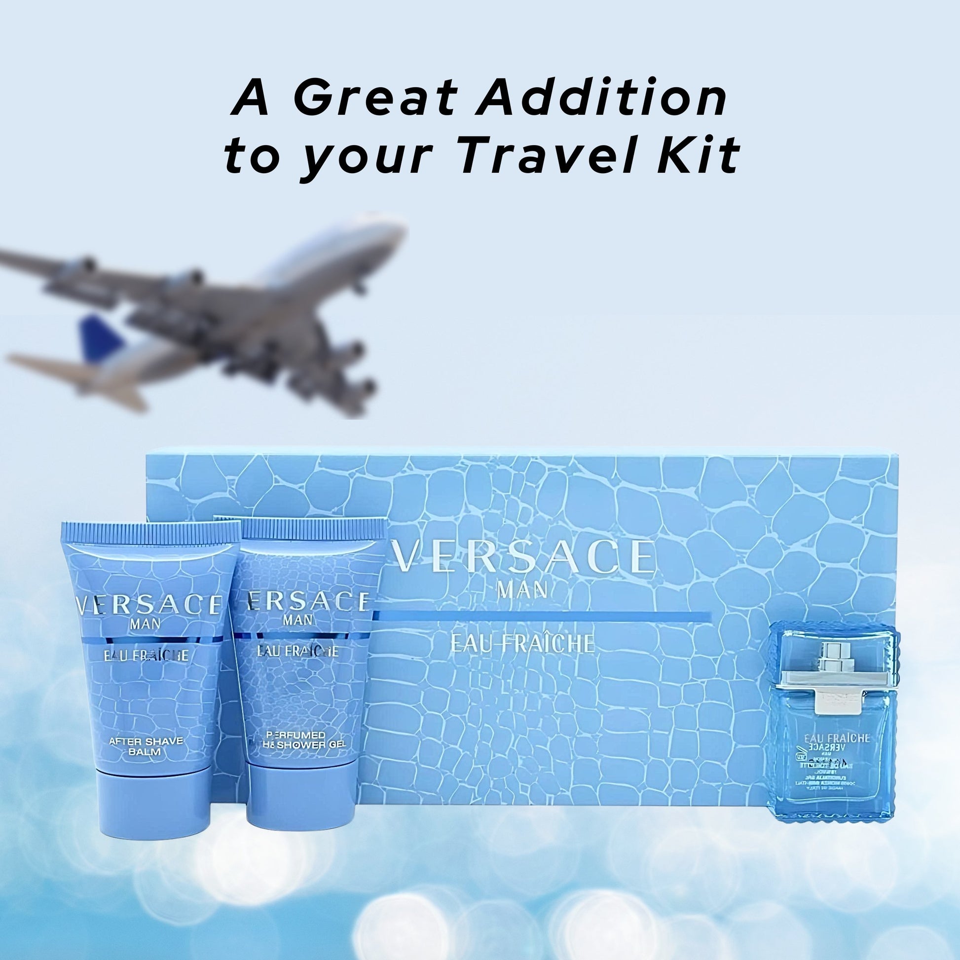 Versace Man Eau Fraiche By Gianni Versace For Men Edt .17 Oz Mini & After Shave Balm .8 Oz Mini & Shower Gel .8 Oz MiniFragrance Notes:Lemon, Rosewood, Carambola, Cedar leaves, TarragonAll vail comes in sample sizeVersace Fresh Water Gift Set Includes:Parfait pour les voyages