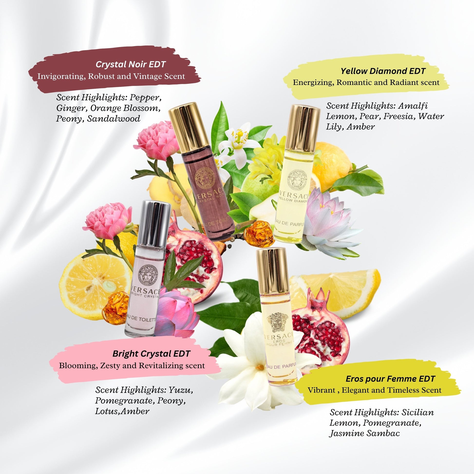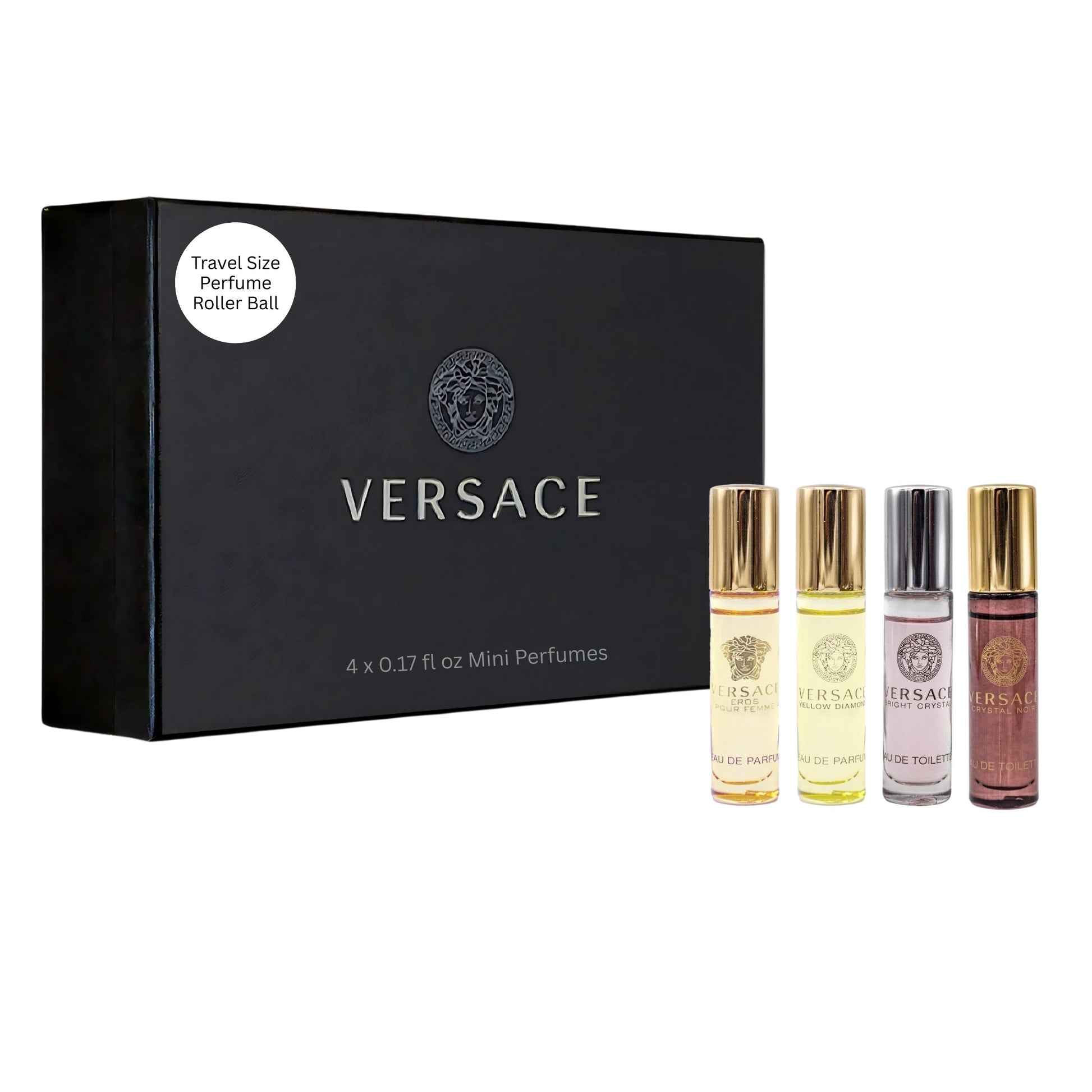 Indulge in the luxurious world of VERSACE with this exclusive Women’s Fragrance Collection. This 4-piece travel gift set includes four of VERSACE’s most beloved scents: Eros Pour Femme, Yellow Diamond, Bright Crystal, and Crystal Noir. Each fragrance is captured in a 0.17 Oz rollerball, making it the perfect companion for your travels or a stylish addition to your handbag. Eros Pour Femme exudes passion and strength, with its blend of lemon, jasmine, and musk. Yellow Diamond shines with its fresh, floral, and vibrant notes. Bright Crystal is cherished for its sweet, fruity, and feminine scent. Crystal Noir offers a rich and mysterious aroma, perfect for evening wear. This set is an ideal gift for any VERSACE enthusiast or a luxurious treat for yourself. Experience the allure and sophistication of VERSACE with every application. Whether you’re exploring new places or need a quick fragrance refresh throughout the day, this versatile set has you covered. Perfect as a thoughtful gift or a personal indulgence, this collection is a must-have for any woman who appreciates the finer things in life.Crystal Noir Perfume For Women 0.17 OzBright Crystal Perfume Sample 0.17 OzYellow Diamond Travel Perfume 0.17 OzEros Pour Femme EDT Rollerball Perfume 0.17 OzTravel Size Luxury Gift Set For Women