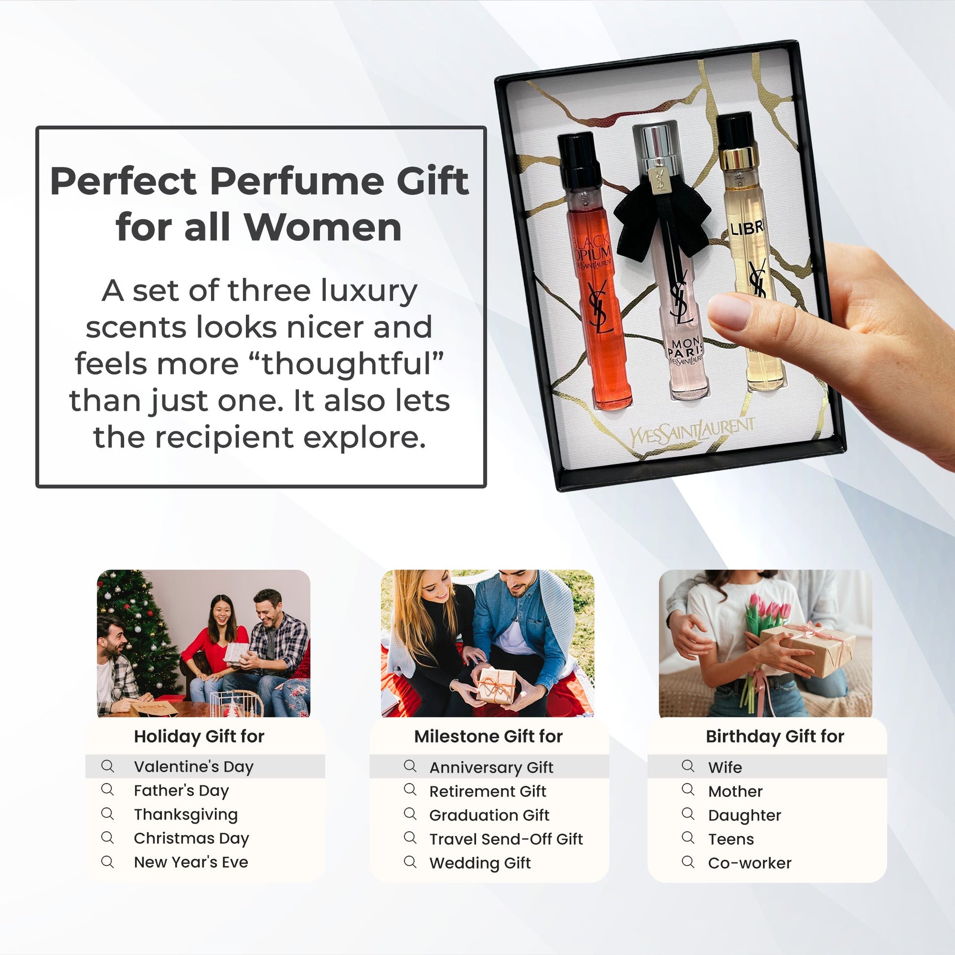 Experience timeless elegance and modern sophistication with this Yves Saint Laurent Perfume Gift Set for Women. Featuring three of YSL's most iconic fragrances — Libre, Black Opium, and Mon Paris — this luxury sampler delivers a high-end scent experience in perfectly portable 0.33 fl oz travel sprays. Whether you're discovering your signature scent or gifting a fragrance lover, this set offers the perfect introduction to YSL's bold and feminine perfumes. Each Eau de Parfum is beautifully crafted to reflect confidence, sensuality, and Parisian glamour. The compact size makes it ideal for travel, your purse, or a luxurious on-the-go refresh. Indulge yourself or surprise someone special with this premium designer fragrance set — a must-have for any woman who loves sophisticated scents and high fashion.